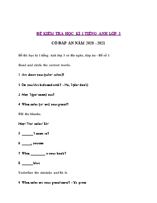 ĐỀ KIỂM TRA HỌC KÌ 1 TIẾNG ANH LỚP 3 CÓ ĐÁP ÁN NĂM 2020 - 2021 Đề thi học kì 1 tiếng Anh lớp 3 có file nghe, đáp án - Đề số 1 Read and circle the correct words. 1. Are those your (ruler/ rulers)? 2. Do you like hide-and-seek? - No, I (do/ don't). 3. May I (go/ come) out? 4. What color (is/ are) your pencil? Fill the blanks. May/ Yes/ color/ It's/ 5. ______ I come in? 6. _____, you can. 7. What ________ is your book? 8. ______ blue. Underline the mistake and fix it. 9. What color are your pencil cases? - It's green. 10. May I go out? - No, I can. 11. Do Lan like skating? 12. Are this your pencils? Listen and write. Bài nghe Ex: Hello, class. 13. __________________________ 14. __________________________ 15. __________________________ 16. __________________________ Read and match. 17. Is this Linda? A. P-H-O-N-G. 18. Are they your friends? B. Yes, it is. 19. How do you spell your name? C. This is Mr. Loc. 20. Who's that? D. No, they aren't. ĐÁP ÁN Read and circle the correct words. 1 - rulers; 2 - don't; 3 - go; 4 - is; Fill the blanks. 5. ____May__ I come in? 6. ___Yes__, you can. 7. What ___color_____ is your book? 8. ___It's___ blue. Underline the mistake and fix it. 9 - It's thành They are/ They're. 10 - No thành Yes hoặc can thành can't; 11 - Do thành Does; 12 - this thành these; Listen and write. 13 - How you do spell your name? 14 - What do you do at break time? 15 - I play hide-and-seek. 16 - These are my rubbers. Read and match. 17 - B; 18 - D; 19 - A; 20 - C; Đề thi tiếng Anh lớp 3 học kì 1 có file nghe + ma trận - Đề số 2 I. MA TRẬN Kỹ năng Nhiệm vụ đánh giá/ kiến thức cần đánh giá Mức/ điểm Tổng số câu , số điểm, tỉ lệ % M1 M2 M3 M4 Listening 5pts =50% 1. Listen and circle 0,5đ (2 câu) 0,5đ (2 câu) 4 câu = 1 điểm 2. Listen and tick 0,25đ (1câu) 0,5đ (2 câu) 0,25đ (1câu) 4 câu = 1 điểm 3. Listen and number 1đ (4 câu) 4 câu = 1 điểm 4. Listen and complete 0,5đ (2 câu) 0,25đ (1 câu) 0,25đ (1 câu) 4 câu = 1 điểm Reading 1,5pts = 15% 5. Read and tick (v) or (x) 0, 5đ (2 câu) 0,25đ (1 câu) 0,25đ (1 câu) 4 câu = 1 điểm 6. Read and write Yes/No 0,5đ (2 câu) 0,25đ (1 câu) 0,25đ (1 câu) 4 câu = 1 điểm Writing 1,5pts = 15% 7. Look and write the words in order. 0,5đ (2 câu) 0,5đ (2 câu) 4 câu = 1 điểm 8. Fill in the gaps 0,5đ (2 câu) 0,5đ (2 câu) 4 câu = 1 điểm Speaking 2pt = 20% -Respond the questions of teacher. 1đ (4 câu) 8 câu= 2 điểm -Discribe the pictures in sts’ book by answering questions of teacher. 0,5đ (2 câu) 0,5đ (2 câu) Tổng số câu 40 câu II. NỘI DUNG ĐỀ THI PART I. LISTENING (5pts) 1. Listen and circle (1pt) 0. Girl: May I __________, Miss Hien? Miss Hien: No, you can’t. a. sit down b. go out c. come in 1. Miss Hien: Good morning class! Class: Good morning Miss Hien! Miss Hien: ___________, please! a. Stand up b. Sit down c. Come in 2. Miss Hien: _________! Boy: Sorry Miss Hien. a. Be quiet b. Stand up c. Good morning 3. Class: Goodbye Miss Hien! Miss Hien: ________ class. a. don’t talk b. come here c. goodbye 4. Mai: May I _______? Miss Hien: Yes, you can a. go out b. come here c. come in 2. Listen and tick P(1pt) c b a 1. c b a 2. c b a 3. b c 4.a 3. Listen and number. (1pt) d c b a 4. Listen and complete (1pt) 0. I’m eight years old. Is your friend? These are my My pen is The school ..is large. PART II. READING AND WRITING (4pts) 1.That is the gym. 2. May I come in ? 3. This is my school bag. 4. This is a pencil. 6. Look and read. Put a tick ( ü ) or cross (X ) in the box. (1pt) 7: Look and read. Write Yes or No. (1pt) 0. skating ______ 2. badminton _______ 1. hide- and- seek. ______ 3. blind man’s bluff _______ 8: Look at the pictures. Write the words. (1pt) Lrure → R_ _ _ _ 1. Tobfolal → f_ _ _ _ _ 2. Irybral → l_ _ _ _ _ 3. Mslla → s_ _ _ _ _ 9: Fill in each gap with a suitable word from the box (1 pt) School things pens Those notebook There are some (1) on my desk. This is my school bag. It is yellow. That is my (2) .. It’s blue. These are my (3) They are black. (4) . are my pencils. They are orange. What color are your pencils? PART III. SPEAKING (2pt) Interview. Ask about personal information (name, age, break time activities, ability) 2. Identifying objects. What’s this/ What’s that/ What are these/ What are those? What color is it? What color are they? 3.Describing the picture. ĐÁP ÁN Q Answer point total 1 1-b 2-a 3-c 5-c 0,25/ each 1 pt 2 1- b 2- a 3- b 4-c 0,25/ each 1 pt 3 1-c 2-d 3-a 4-b 0,25/ each 1 pt 4 1. that 2. Books 3. Blue 4. Playground 0,25/ each 1 pt 5 1. X 2.V 3. V 4. x 0,25/ each 1 pt 6 1. No 2. Yes 3. No 4. No 0,25/ each 1 pt 7 1. ruler 2. Football 3. library 4. small 0,25/ each 1 pt 8 1. school things 2. Notebook 3. Pens 4. Those 0,25/ each 1 pt 9,10 Speaking test 0,25/ each 2 pts Transcript 1. Listen and circle: (1pt) 1. Miss Hien: Good morning class! Class: Good morning Miss Hien! Miss Hien: sit down, please! 2. Miss Hien: be quiet! Boy: Sorry Miss Hien. 3. Class: Goodbye Miss Hien! Miss Hien: goodbye class. 4. Mai: May I come in? Miss Hien: Yes, you can 2. Listen and tick: (1pt) 1. This is my penbox. It is old. 2. This is my pencil sharpener. It is red. 3. That is my ruler. It is big. 4. These are my pens. They are new. 3. Listen and number. (1pt) 1. How old are you, Peter? I’m seven years old. 2. What’s your name? My name’s Mary. How do you spell Mary? That’s M-A-R-Y 3. Who’s that? It’s my friend, Linda. 4. Hello, Mai. How are you? Hi, Tony. I’m fine, thank you. And you? I’m fine. thanks 4. Listen and complete. (1pt) 1. Is that your friend? 2. These are my books 3. My pen is blue 4. The school playground is large.